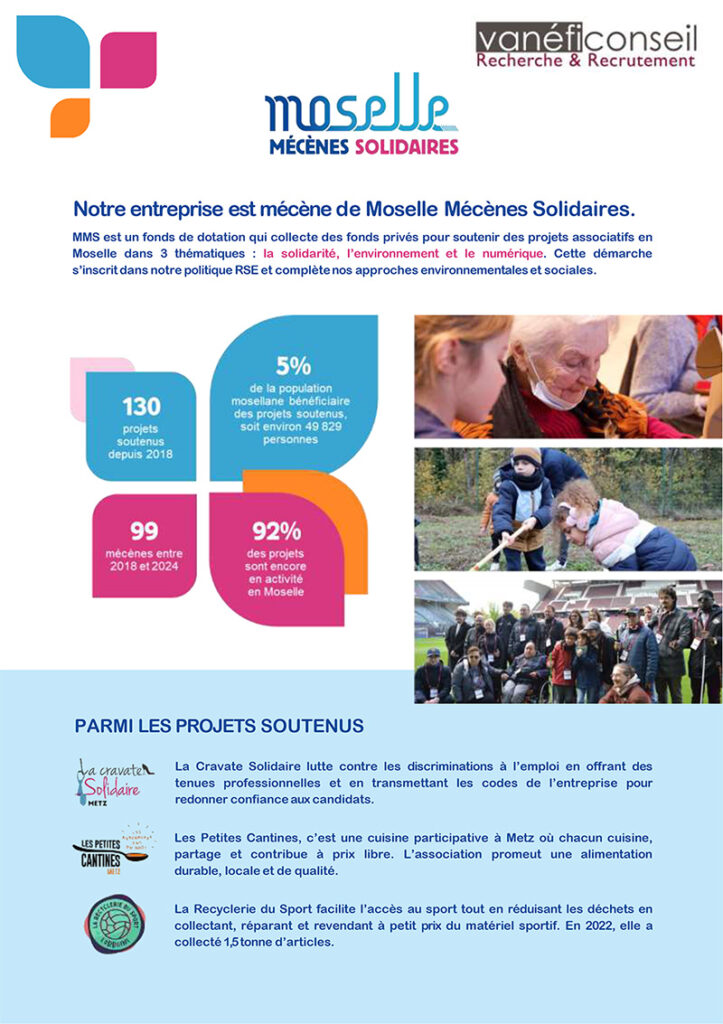 Chez Vanéfi Conseil, nous allons au-delà du recrutement. En tant que mécène de Moselle Mécènes Solidaires, nous soutenons des initiatives locales qui favorisent la solidarité, l’innovation et le développement durable. Pour nos clients comme pour nos candidats, c’est la garantie de travailler avec un partenaire qui agit avec responsabilité, intégrité et impact positif sur son territoire.